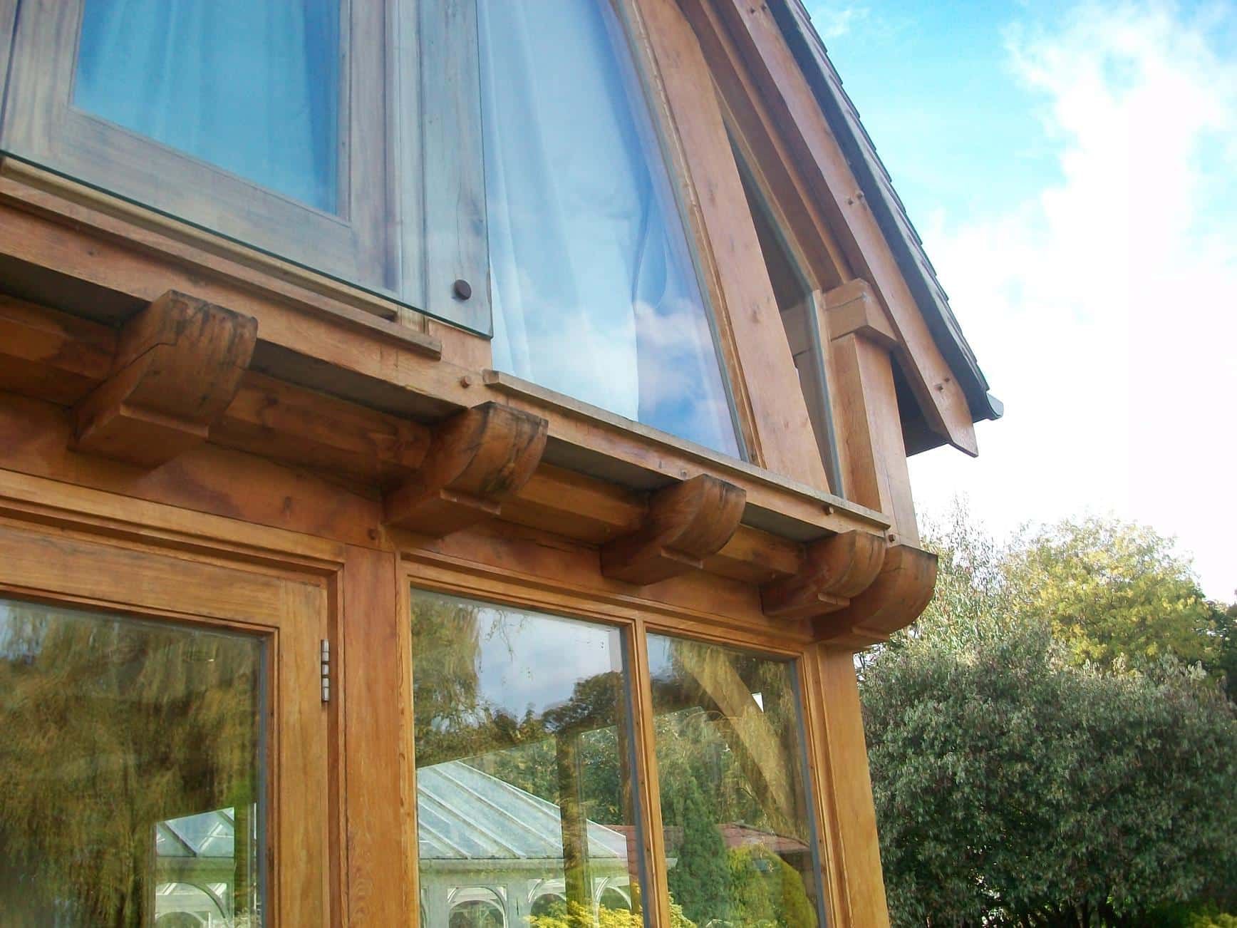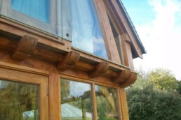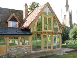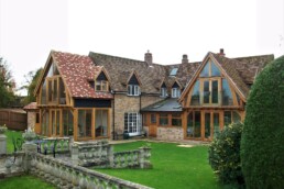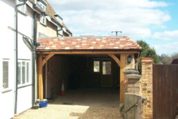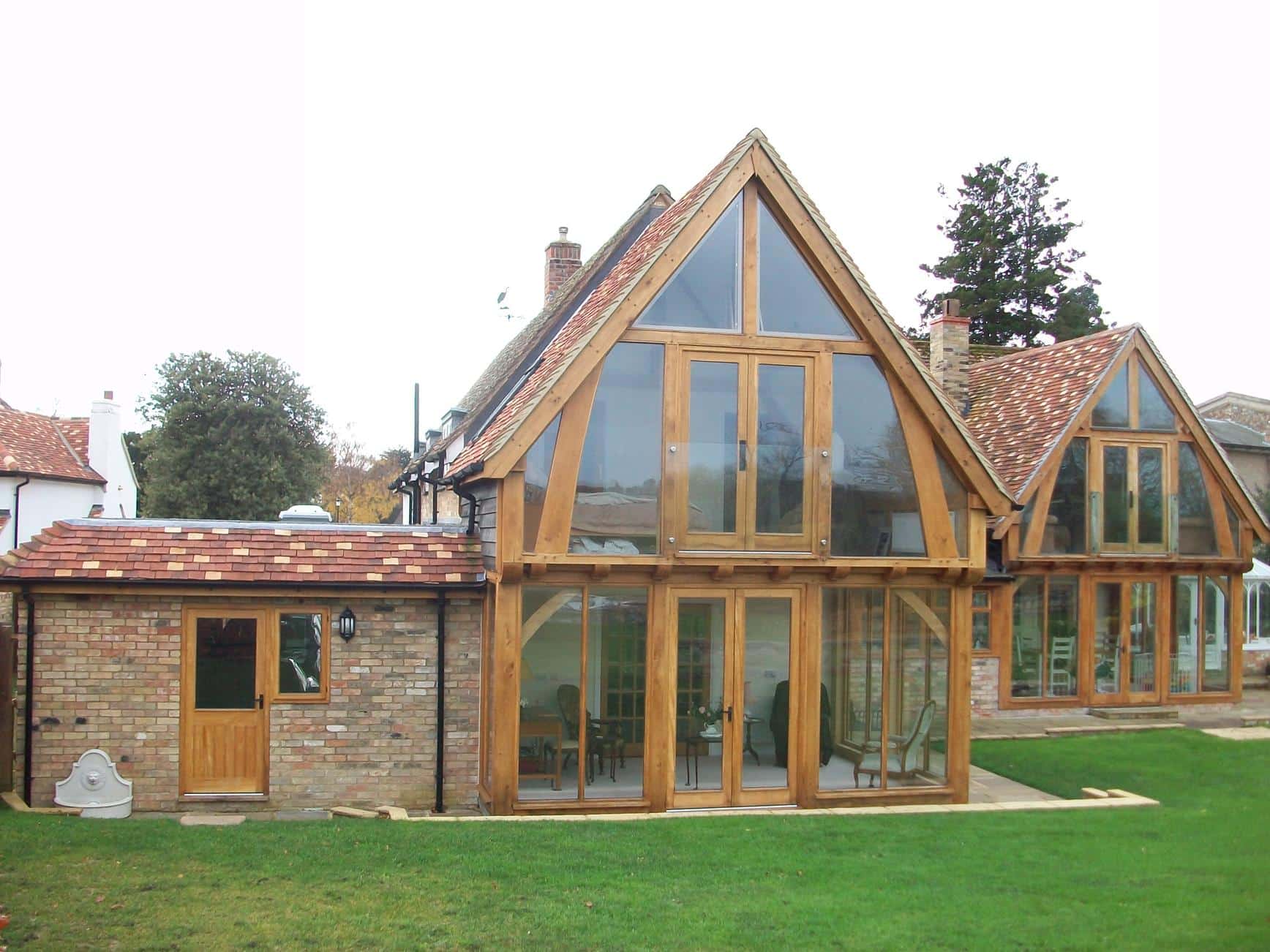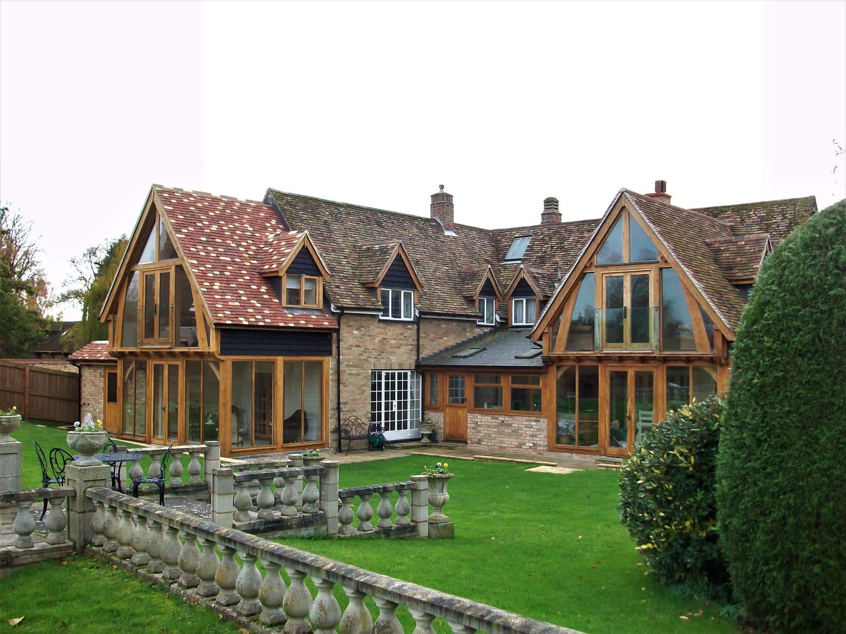 The twinning second extension was completed a few years later, a similar sized project compromising of a south-west facing reading room and additional guest bed room. Again existing dorma windows were remodelled to pitched. Alongside the new extension, a long two-bay garage with mansard roof and personnel door for access to the rear of the property was built. Both of the crucks frame extensions feature detailed canter leaver (overhanging first floor detail).