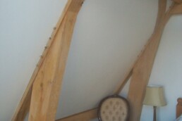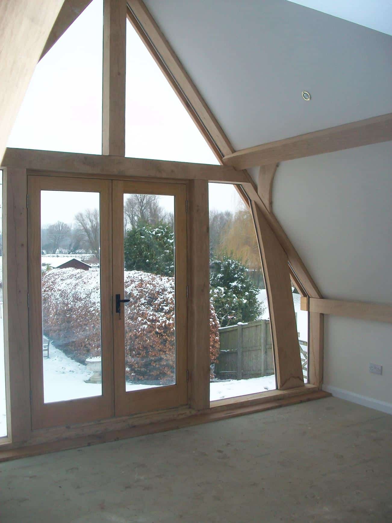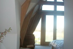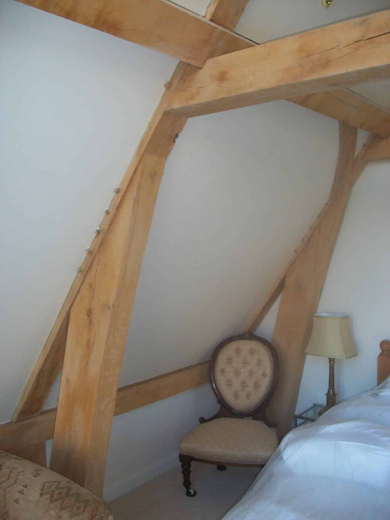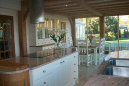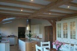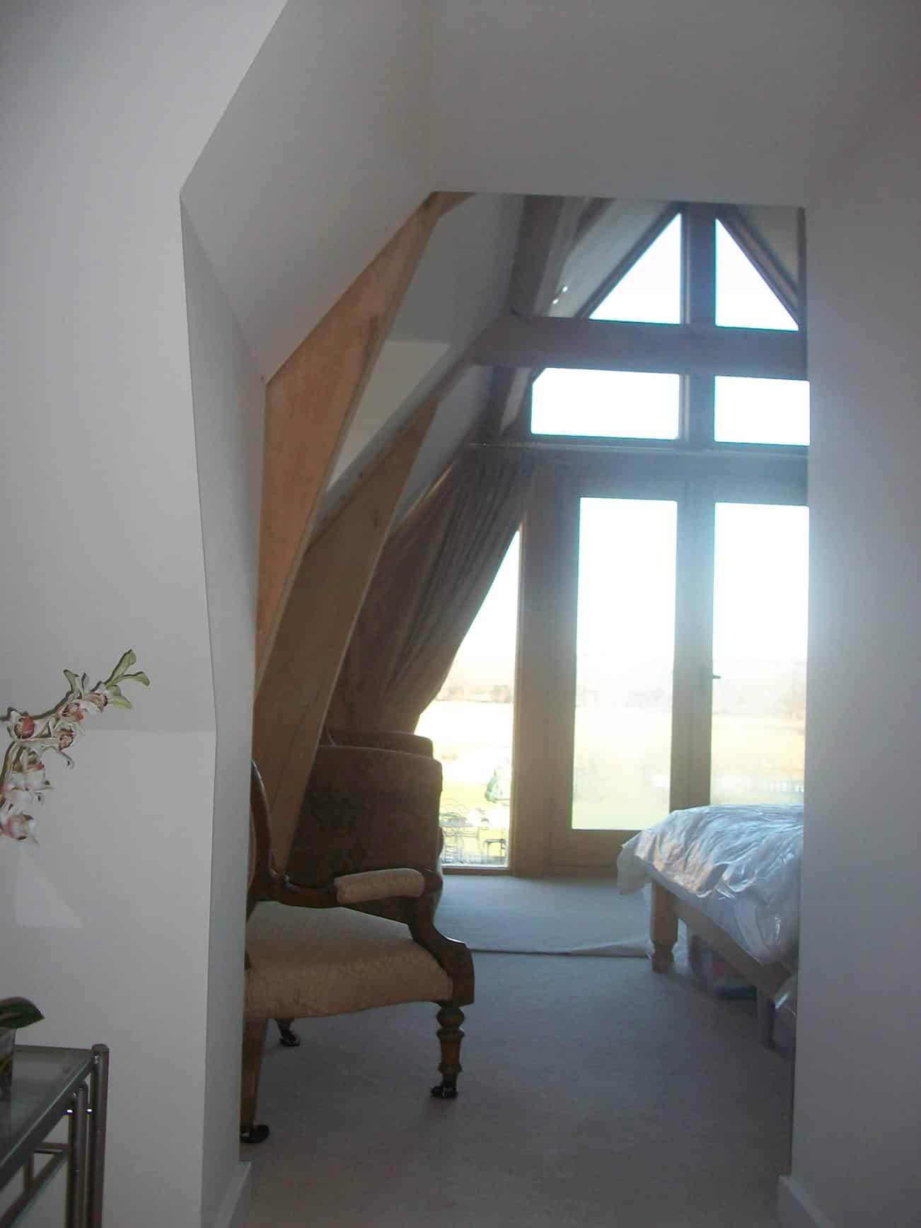 On the exterior the kitchen has a mono-pitched roof with two Velux windows. Matching oak joinery of the single storey extension and crucks frame joins the two seamlessly. The exterior of the crucks frame presents French solid oak patio doors surrounded by large double glazed glass panes allowing light to engulf the kitchen diner throughout the day. The same French solid oak patio doors are used in the extended bedroom above that open onto a Juliette balcony. A side personnel door at the far left side of the kitchen opens out into the granary grounds. Finally the existing flat roofed dorma windows were remodelled into pitched roof dormas to match the new dormas.