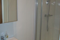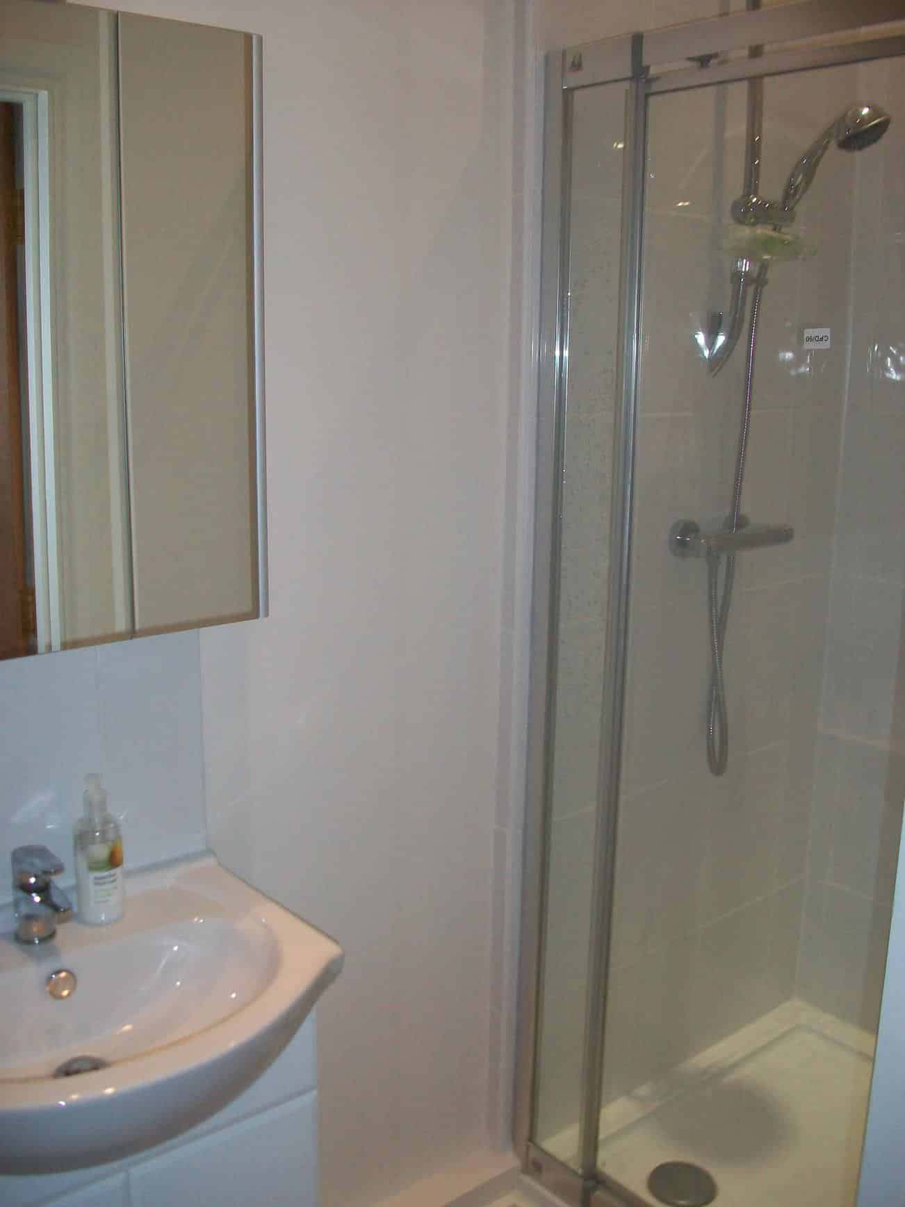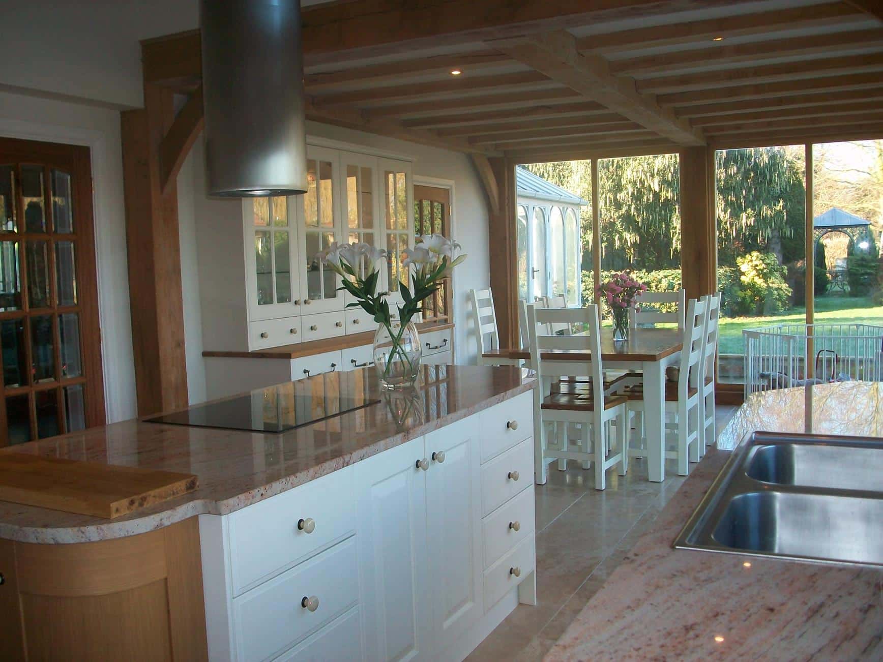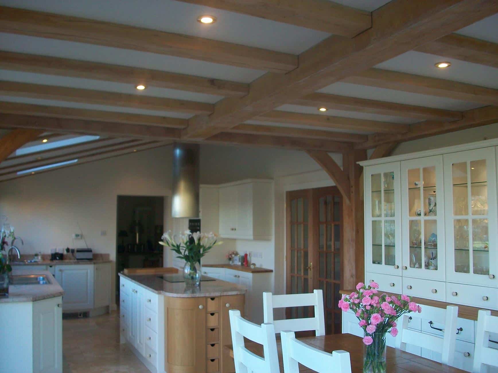 The first extension includes a ground floor and second storey bedroom extension. The groundfloor extension entailed a contemporary open plan kitchen and dining area, including underfloor heating, cream country farm house cupboard and cabinets and the yearned kitchen island, All of which fashioned to compliment the charming Welsh dresser. The ceiling is bright white, scattered with natural oak beams and embellished with warm white spot lights. Traditional farm house dining table poses in the centre of the diner area, offering itself for essential family meal times. The bedroom boasts a similar scattering with structural grade green oak beams fixed by traditional motis and tenon joints with kiln dried pegs.